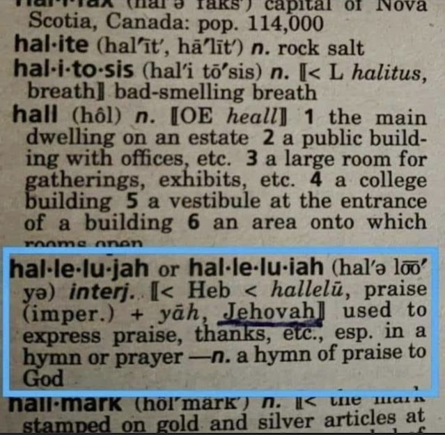 LL(Ec) alleluja < Gr(Ec) hallēlouia < Heb < hallelū, praise (imper.) + yāh, Jehovah